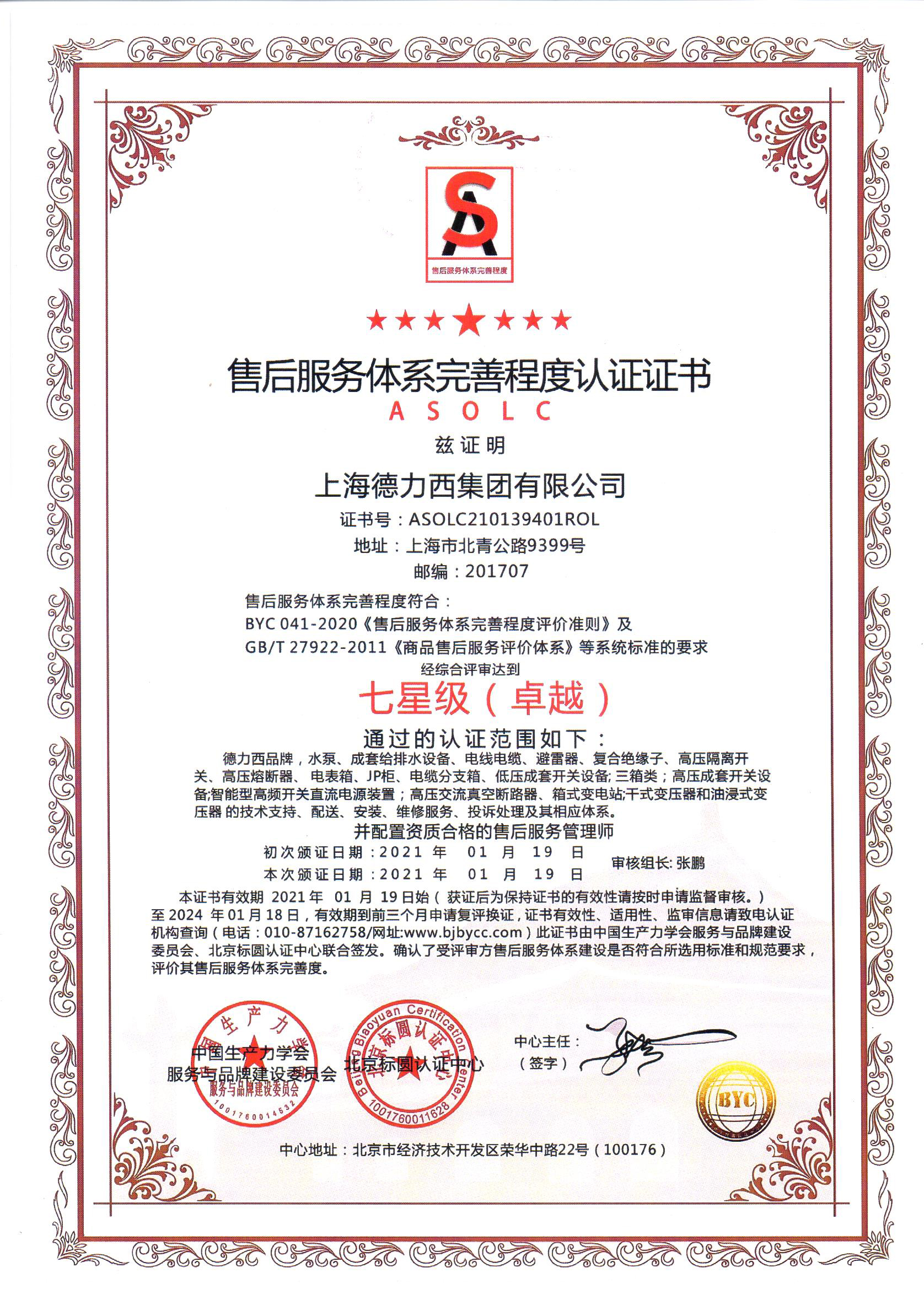 售后服務(wù)認(rèn)證證書